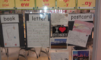 I read the cards to my students and showed them the different types of illustrations they could try out. I provided a template from a Lakeshore, Writing Center, and my students are able to write Postcards about places they have visited or would like to go. In addition to postcards there are samples of various other types of writing they can do during Daily 5: Writing. The window shows choices and examples on both sides. When the students are sitting at the table outside of the window, they can see these ideas as well as when they are inside. Here is a list of the examples:
