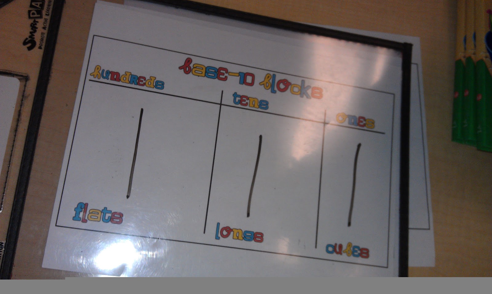 I placed them in my Clear Board Communicators. We are able to then re-use these again and again. I made 2 versions, 1 with the picture of the Base 10 Block and 1 without. I copied them back to back and place them in the clear board (love these things). The kids were able to place the blocks on the mat and get great place value practice.